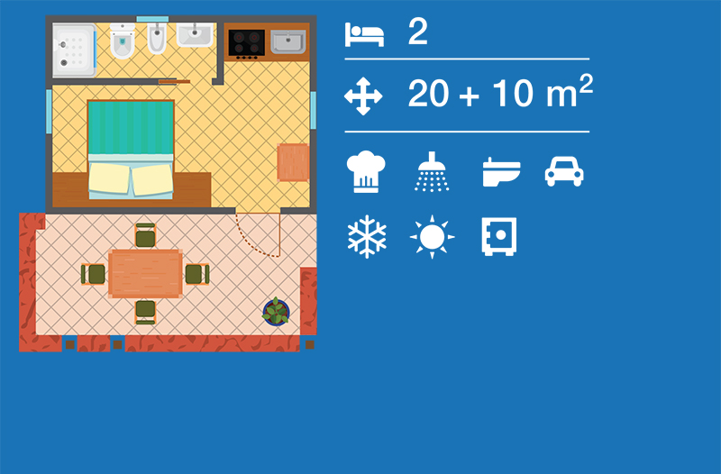 Il bungalow 2 posti è la scelta perfetta per una vacanza in coppia in Sardegna, immersi nella natura e a pochi passi dal mare. Questa comoda casetta è disponibile in due versioni: in legno (tipo “Natura”) o in muratura (tipo “Comfort”), con interni uguali, sia nella disposizione degli spazi che nel design degli arredi, entrambe curate nei dettagli per offrire un soggiorno rilassante.