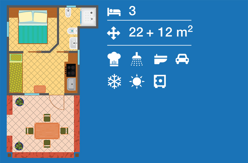 Il bungalow 3 posti è la soluzione ideale per una vacanza in coppia o con un bambino in Sardegna, immersi nella natura e a pochi passi dal mare. Questa comoda casetta è disponibile in due versioni: in legno (tipo “Natura”) o in muratura (tipo “Comfort”), con interni simili, sia nella disposizione degli spazi che nel design degli arredi, entrambe curate nei dettagli per offrire un soggiorno rilassante.