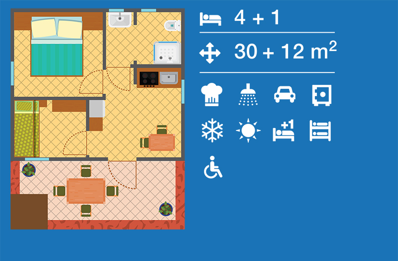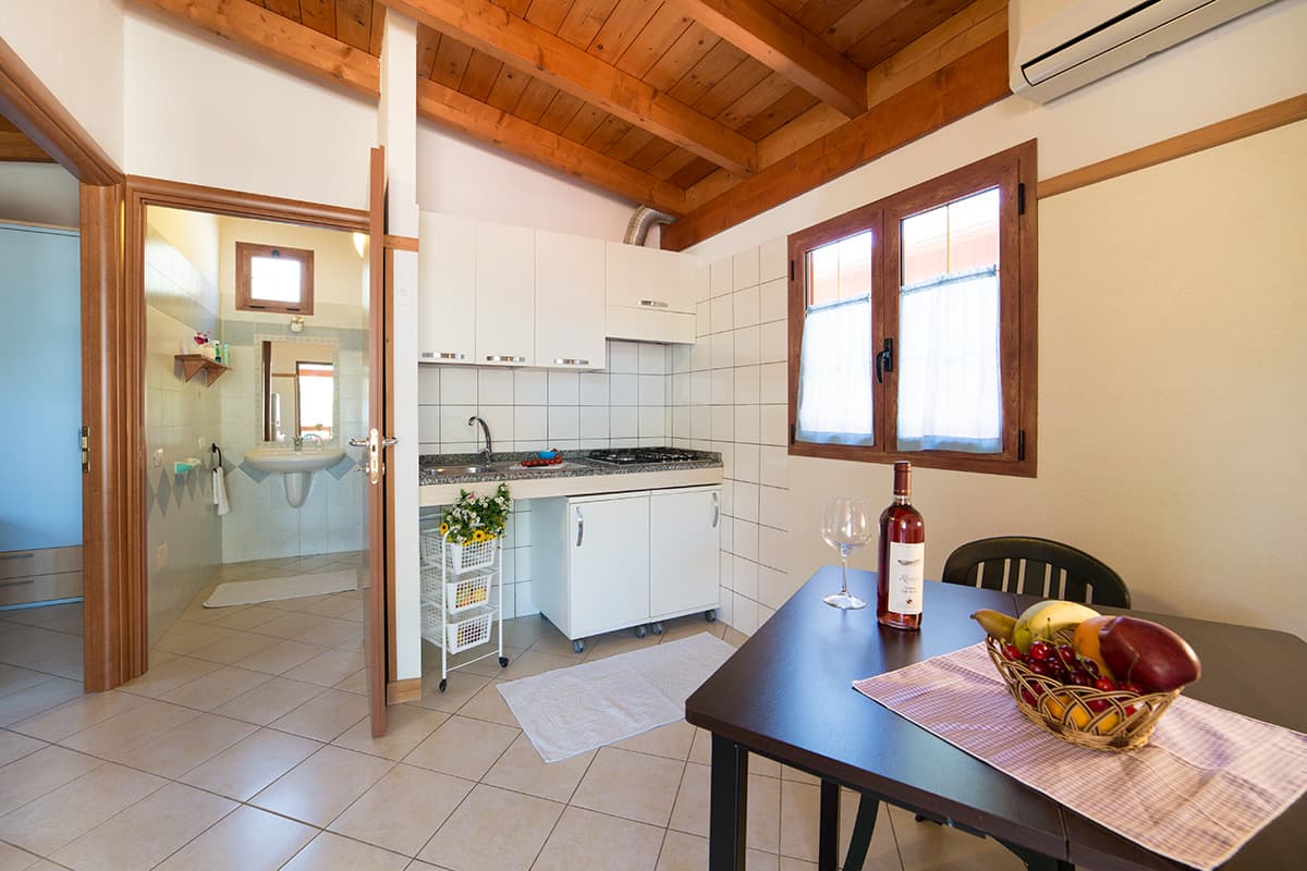 (uscite con discese ripide non adatte per la carrozzina) e 150/200 metri dall’uscita in piano con passerella. Il bungalow è interamente non fumatori e una unità è pet-friendly disponibile per ospitare famiglie con un cane.